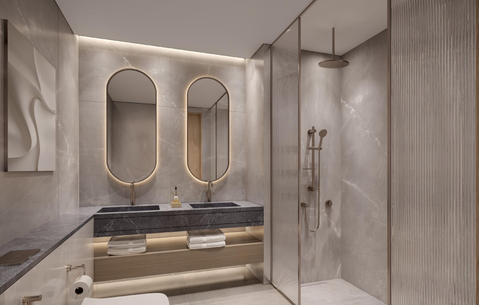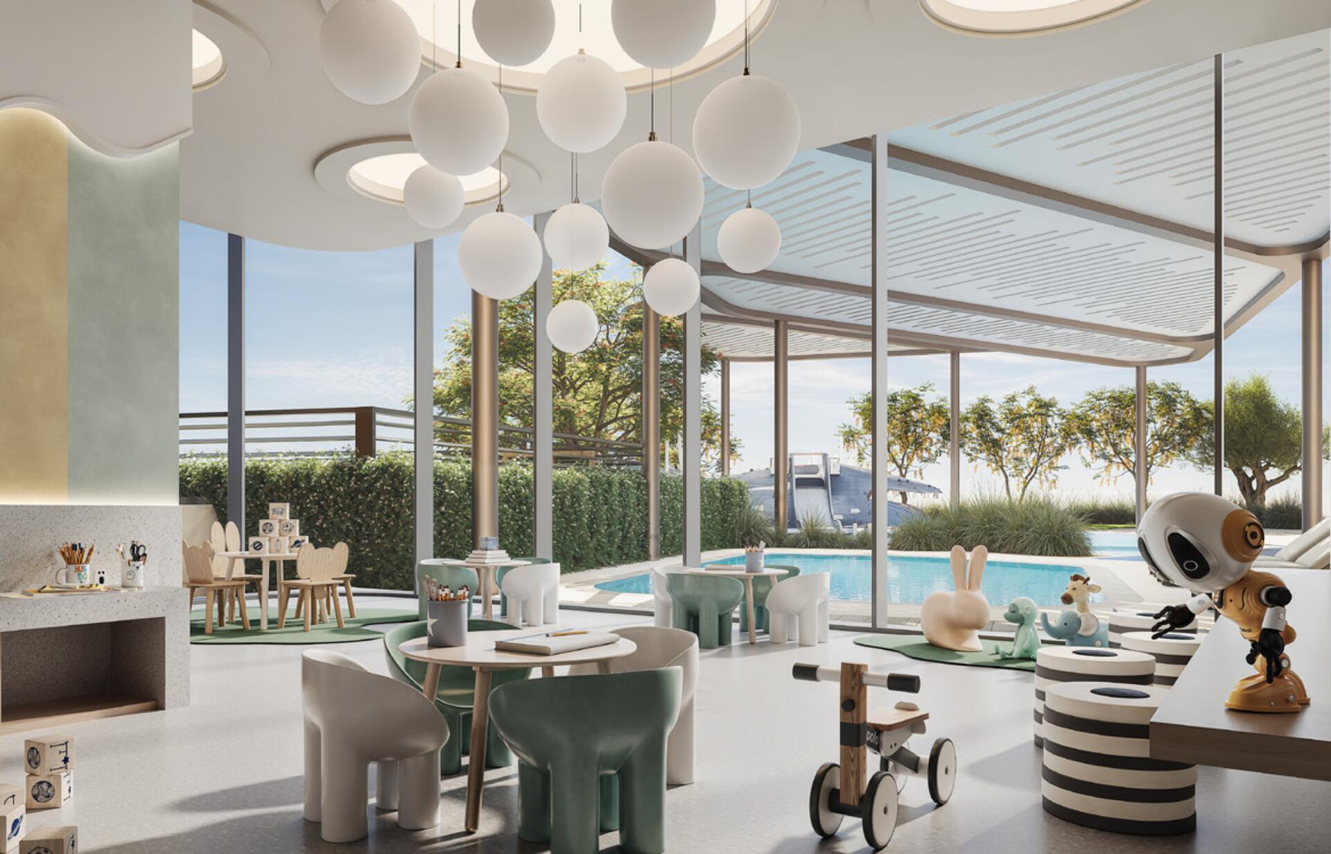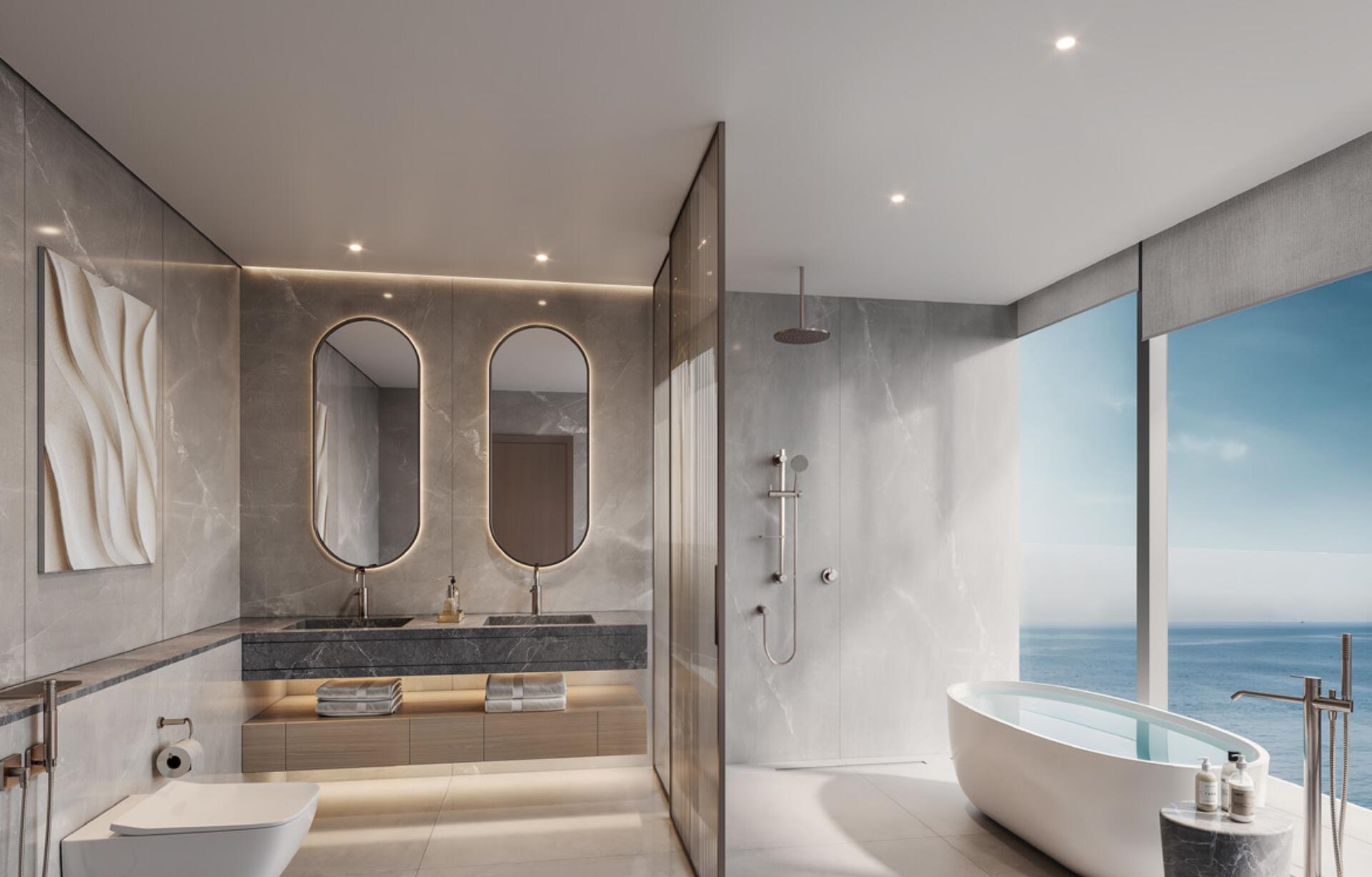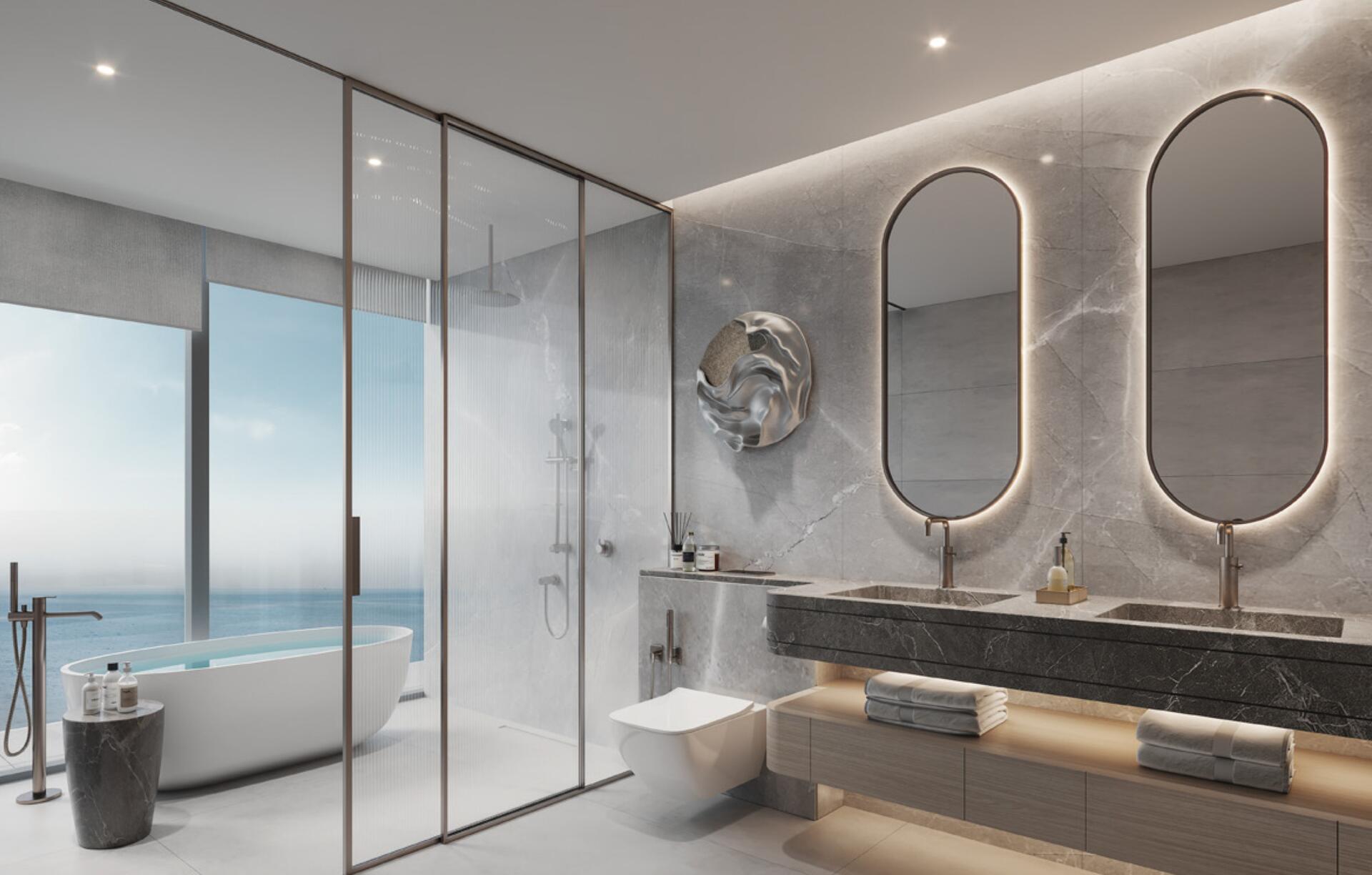 Amenities extend across podium, mid-level decks, and the rooftop. The podium offers lagoon-inspired pools, jacuzzis, cabanas, children’s areas, sports zones, and an outdoor cinema lawn. Upper decks provide relaxation terraces, workout spaces, a teens hub, and landscaped seating. The rooftop features an infinity pool, jacuzzi, cabanas, and a sky lounge with views of the sea and the city.