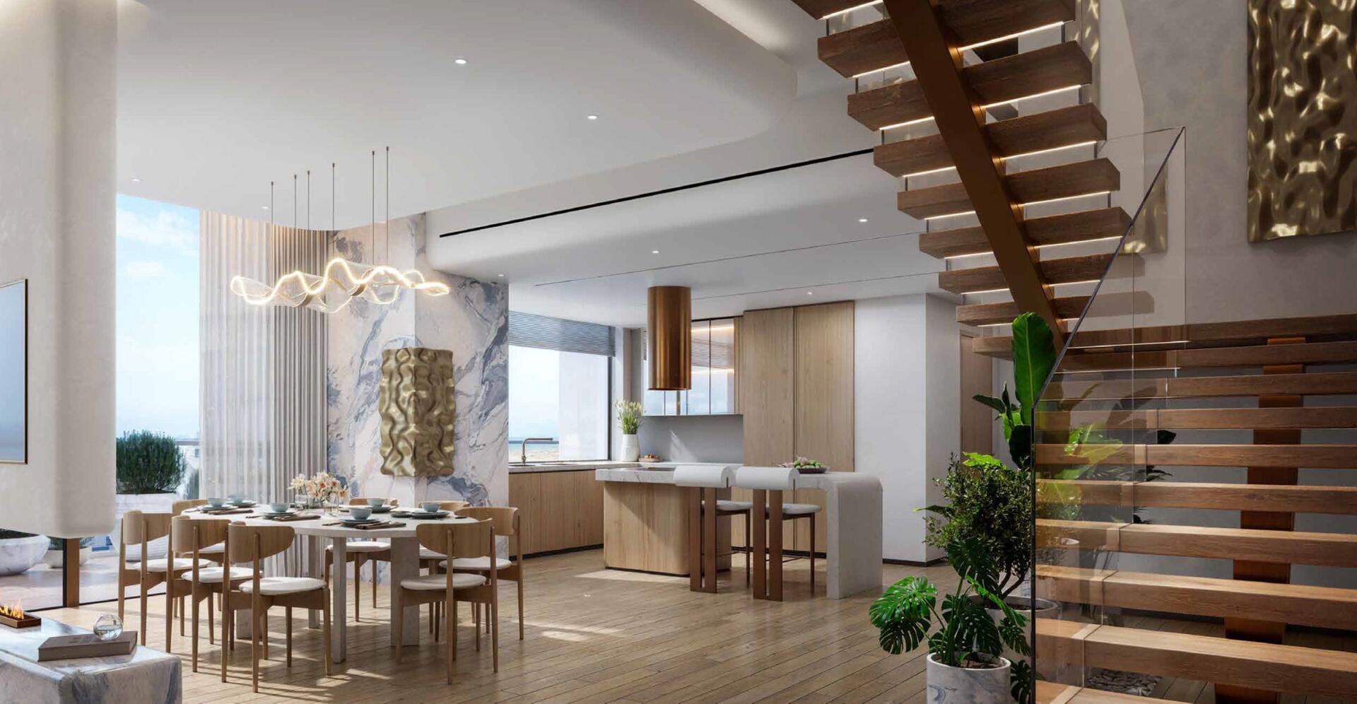 The development offers a selection of 1, 2, and 3-bedroom apartments, along with spacious 4-bedroom duplexes. Interiors feature light natural tones, open living and dining areas, well-planned kitchens, and generous storage solutions. The design emphasizes natural textures and soft hues to create bright, comfortable residential spaces.